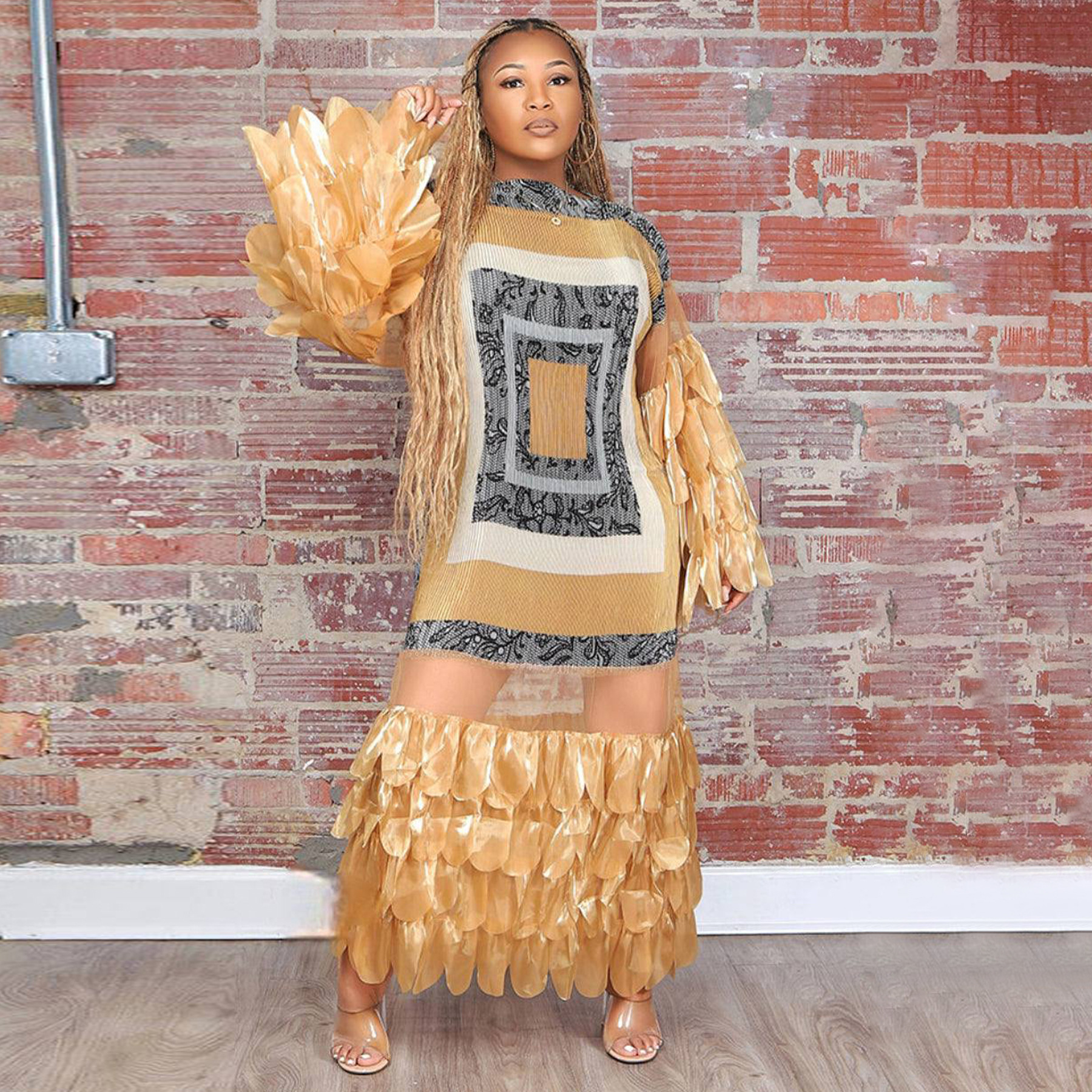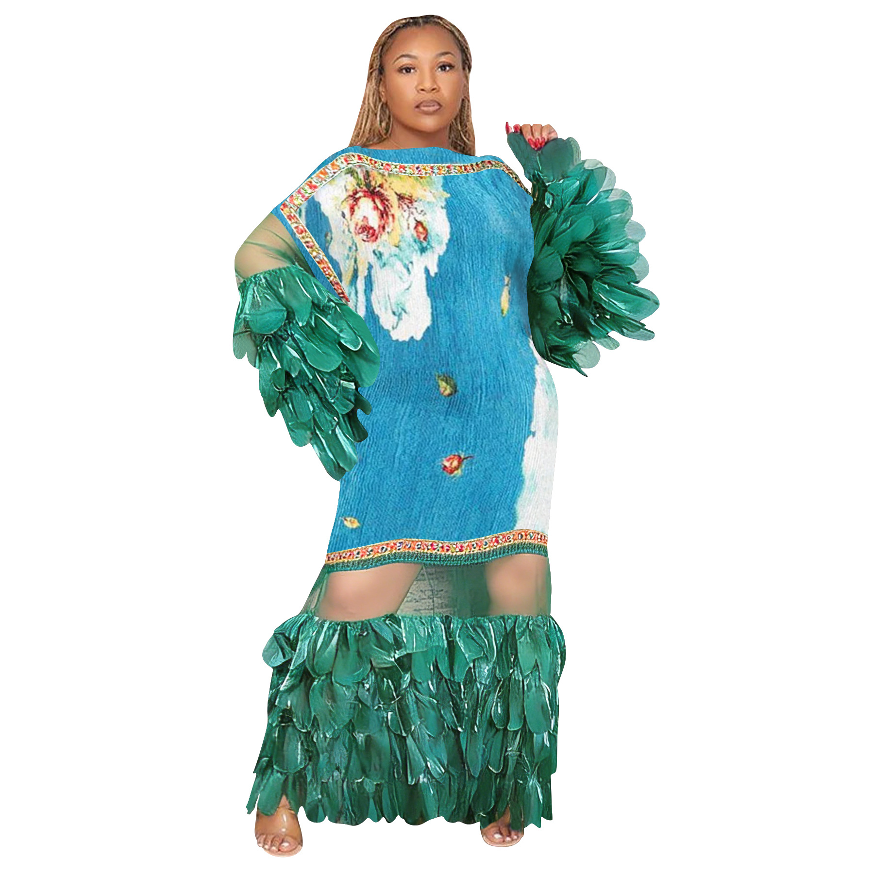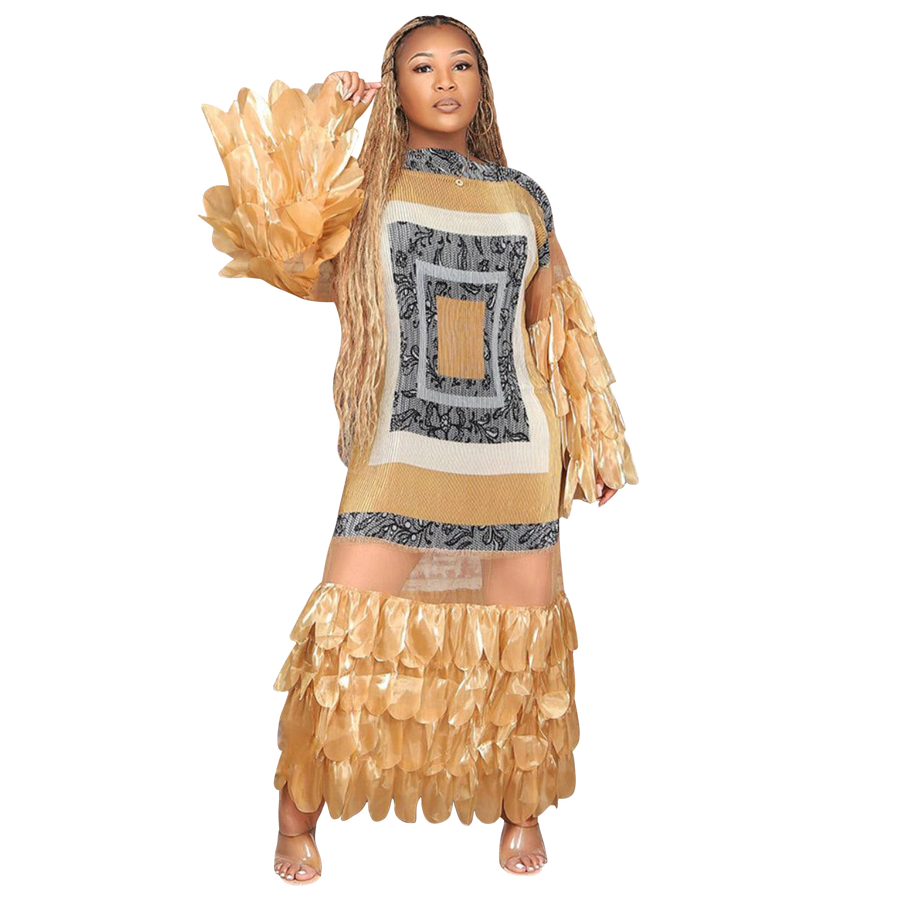 Feather-look Sheer Patchwork Pleated Dress