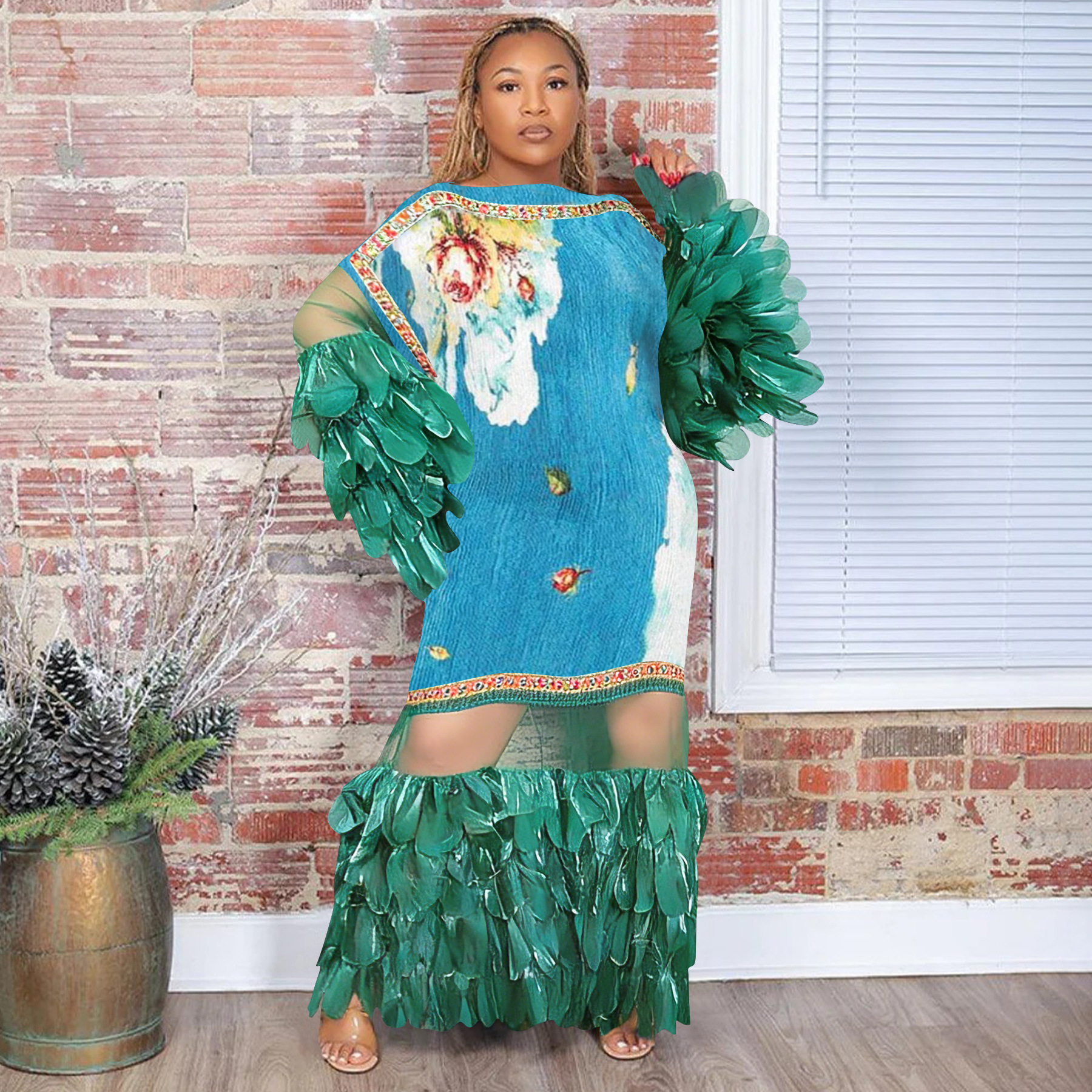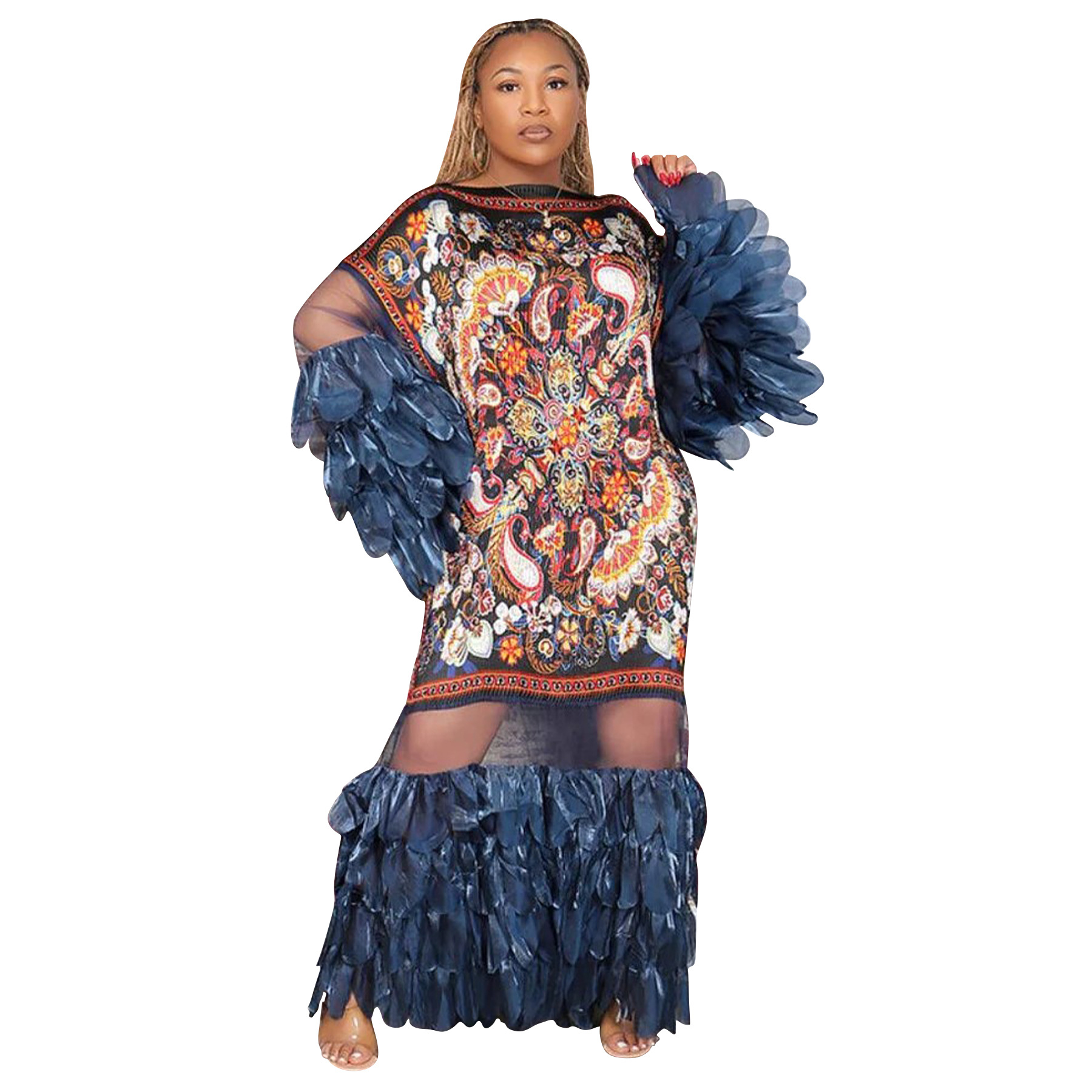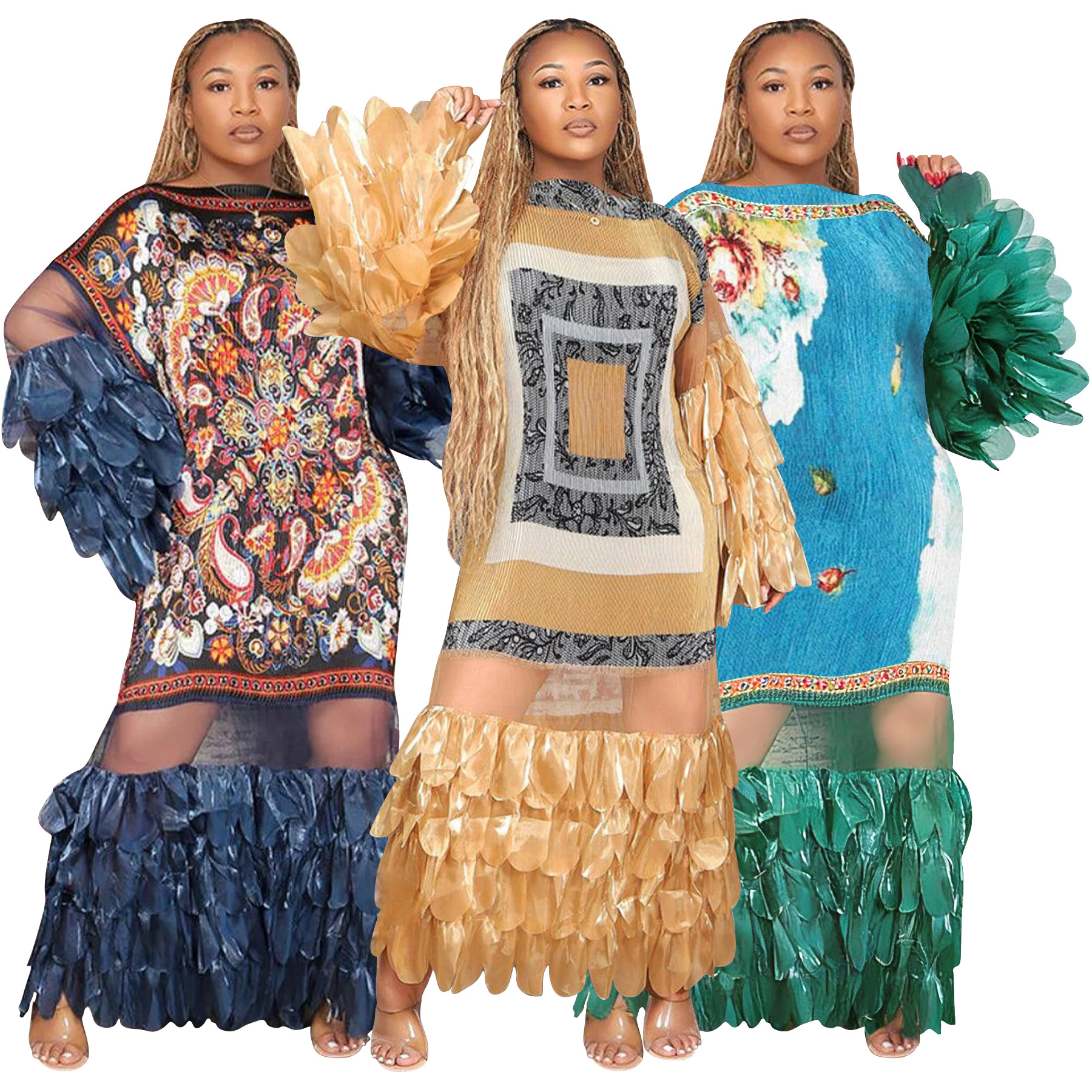 Feather-look Sheer Patchwork Pleated Dress